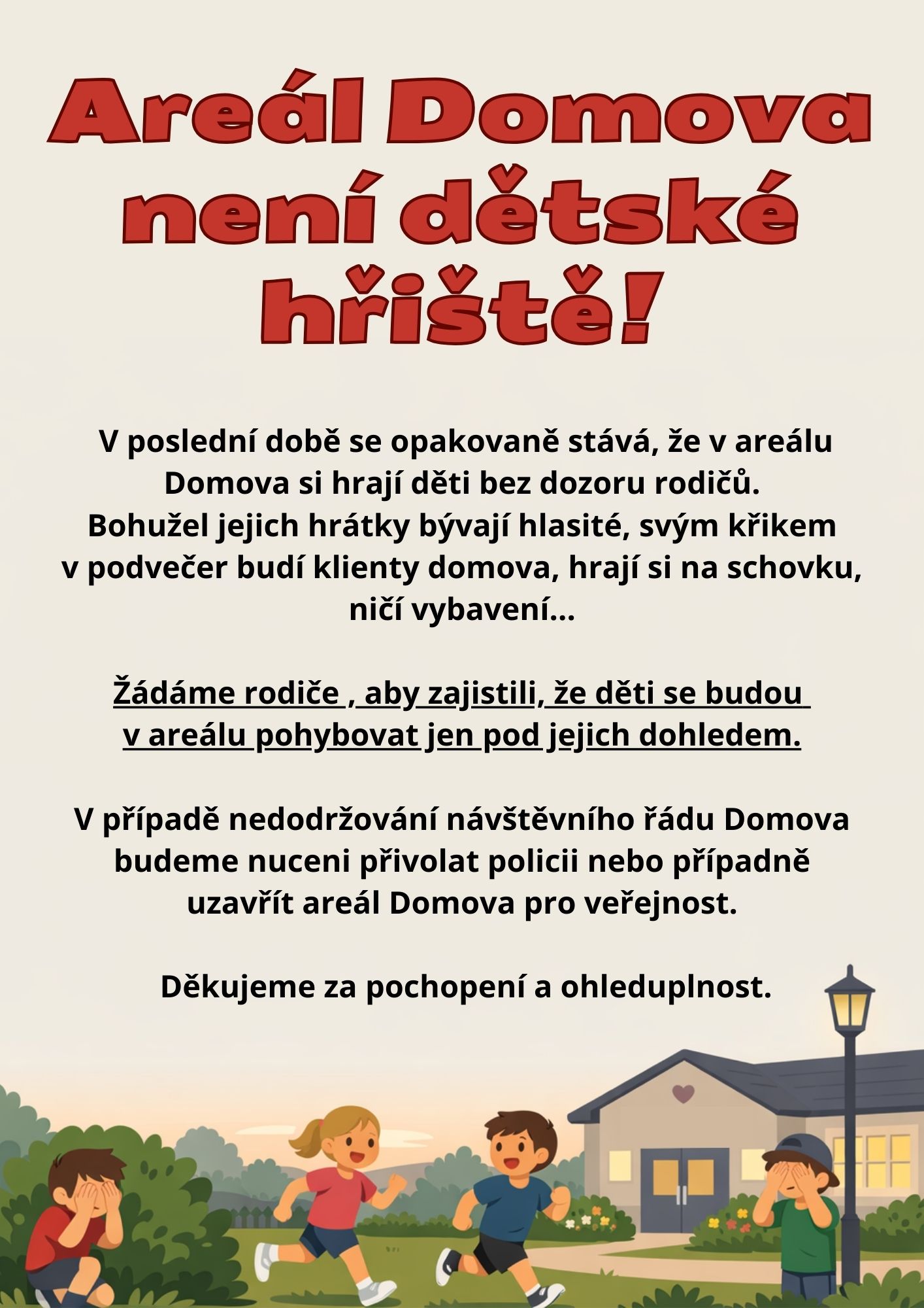 Areál Domova pro seniory NENÍ dětské hřiště!!!